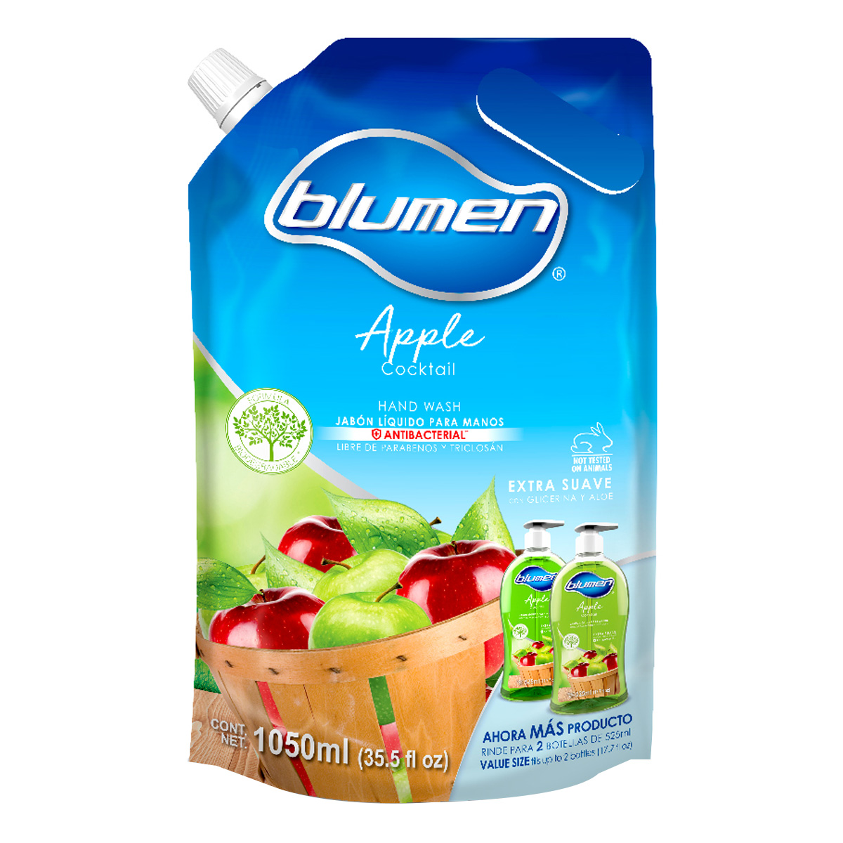 Jabón Líquido Para Manos Blumen, Apple. Presentación Doy Pack De 1.05 Litros. Siéntelo En Tu Piel. Protege Y Suaviza Tu Piel, Para Evitar Resequedad. Con Glicerina, Aloe Vera Y Vitamina E.
